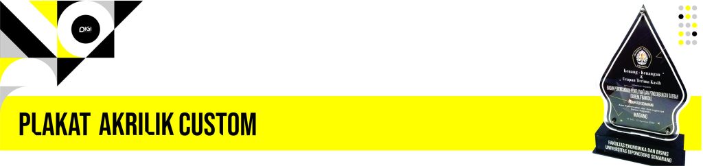 Plakat akrilik instan adalah istilah yang kami sematkan kepada plakat jenis ini. Terkenal dengan sebutan instan karena plakat akrilik jenis ini telah tersedia dalam bentuk yang sudah paten, seperti bentuk gunungan, undip serta daun. Ketika ada pesanan, kami tinggal mendesain konten serta menyesuaikan dengan bentuk plakat akrilik itu. Proses pembuatan relatif cepat dan menjadi favorit bagi konsumen yang memiliki agenda acara mendadak.